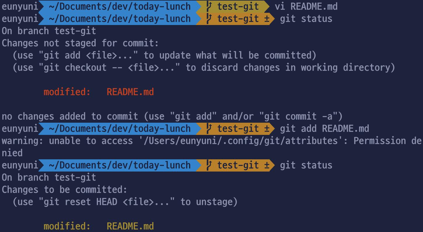 vi README.md- vi로 열어라git status- commit해야할 목록 확인git add README.mdgit status- 확인: On branch earth123 Changes to be committed