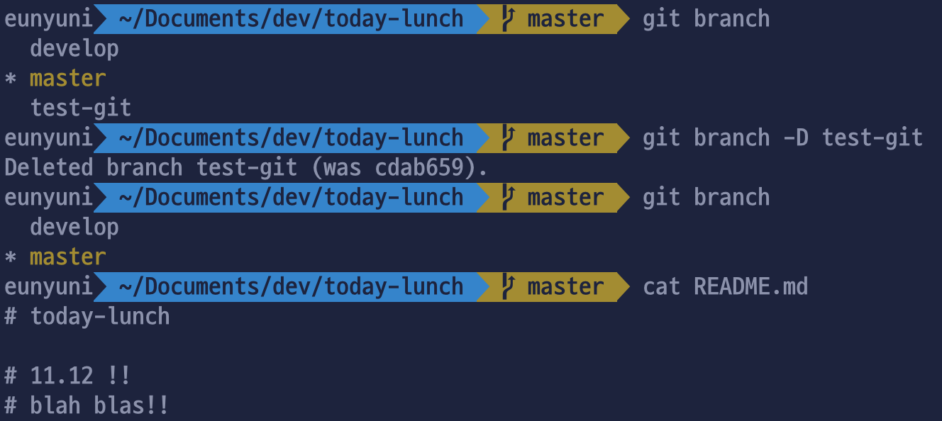 git branch -> git branch -D {file이름} -> git branch -> cat README.md - 실험한 파일 확인